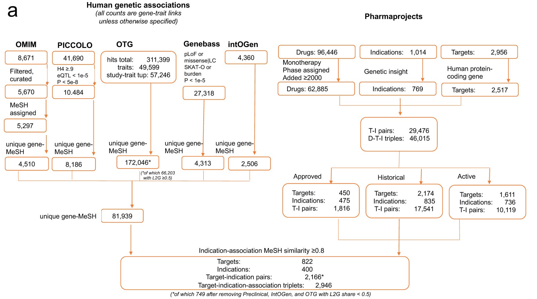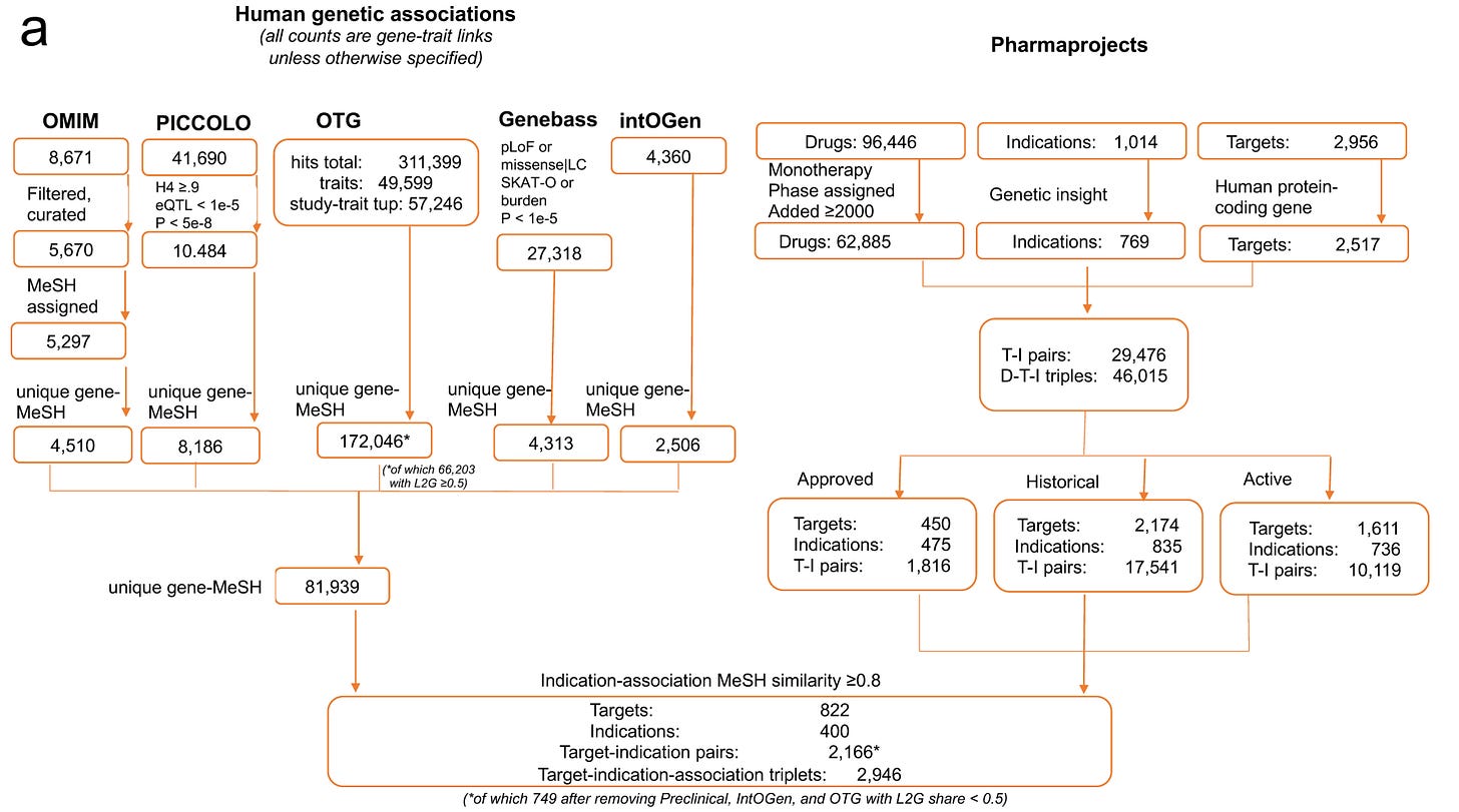 I would assume that the straightforward approach would be to take the 25,713 T–I pairs and determine whether each has genetic support or not. Instead, the authors first compiled all available genetic datasets identifying more than 180,000 significant gene–trait associations, independently of the drug development dataset. They then linked each trait studied in the genetic evidence space to a MeSH term, ultimately generating 81,939 gene–indication pairs. Only at that stage did they attempt to map these associations to the 25,713 T–I pairs derived from the drug development space.
