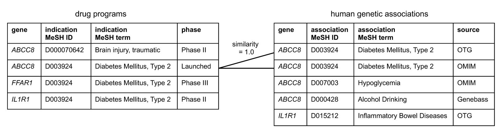 At first glance this feels like a substantial detour, but one could argue that it represents a parallel effort independent of the drug development dataset, potentially increasing objectivity. A key challenge, however, is that the terminology used in the Citeline database for indications (with all the issues described earlier) must be matched to traits studied in genetic analyses. This is far from trivial. Genetic studies are rarely designed with drug development pipelines in mind; their primary goal is usually to discover new biology.