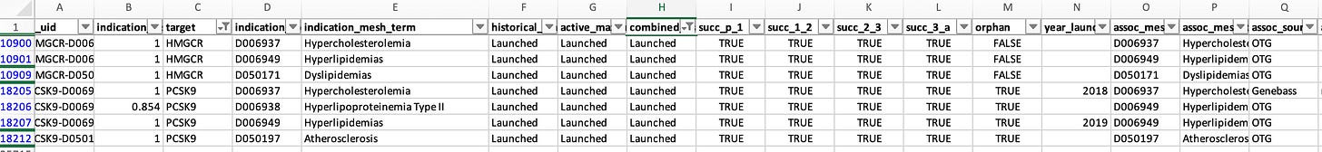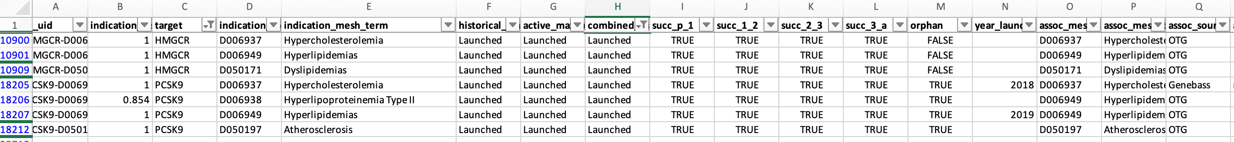 HMGCR, the gene coding for the target of statins, is listed as launched for 3 indications: hypercholesterolemia, dyslipidemias, and hyperlipidemias. The same applied for PCSK9, which is listed as launched for hypercholesterolemia and hyperlipidemias. All of these pairs are classified as genetically supported. These indications are, of course, very closely related (in essence duplicate entries), so counting them multiple times can influence the results.
