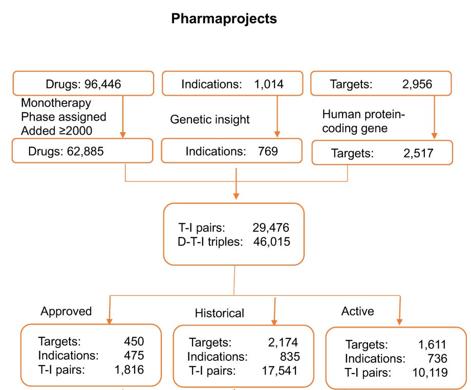 How did the authors exactly filter T-I pairs? They focused on 62,885 monotherapy programmes tested after 2000, corresponding to 2,517 targets across 769 tested indications. This resulted in 29,476 unique T-I pairs or 46,015 drug-target-indication triplets. The T-I pairs were further classified into approved programmes (1,816 pairs), historic programmes that had been concluded (17,541 pairs), and active programmes still in development(10,119 pairs).