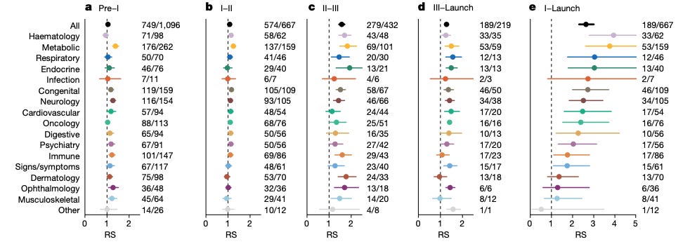 The headline result was an RS of 2.6 (95% CI: 2.3–3.0) from phase I to launch. The effect varied by therapeutic area, ranging from >3.5 for hematology and metabolic diseases to non-significant differences (confidence intervals including 1) for dermatology, ophthalmology, and musculoskeletal diseases.