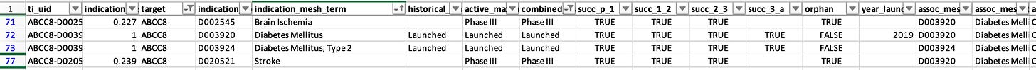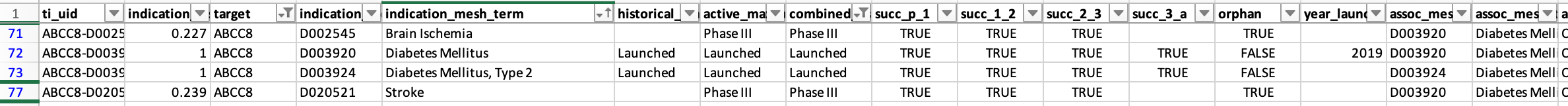 This pattern of duplicate entries is seen across many approved drugs or drugs in advanced development. For example, ABCC8, the target of sulfonylureas, is marked as launched for both “Diabetes Mellitus” and “Diabetes Mellitus, type 2.” The same target is listed at Phase III for both “Stroke” and “Brain Ischemia”.