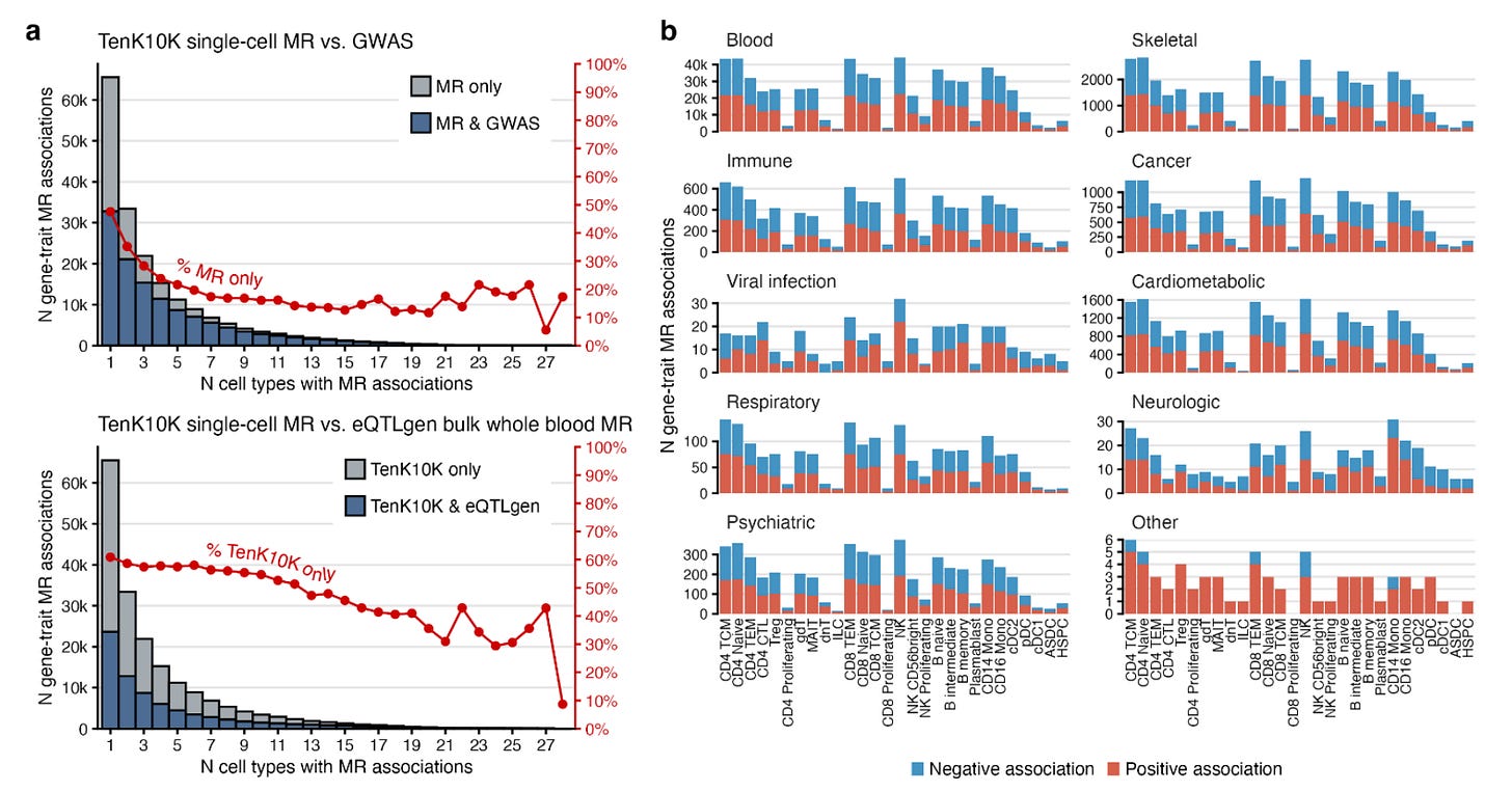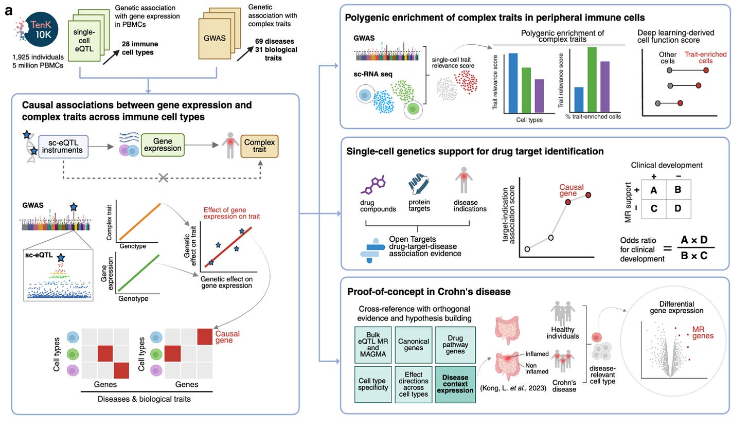One of the most promising initiatives in this arena is the TenK10K project, which aims to collect 50 million peripheral blood mononuclear cells (PBMCs) from 10,000 participants and perform scRNAseq and whole genome sequencing in all of them. The short-term goal is to link genetic variation with gene expression in a meaningful sample size. The long-term goal is to provide explanations for the mechanisms of action of individual disease-causing variants. Last week, the consortium published a study with the first wave of these results. It’s a study on 1,928 individuals and single-cell eQTL data from 28 peripheral immune cells. The authors linked single-cell eQTLs they detected before to 69 diseases and 31 biological traits from other GWASs. To do this, they used Mendelian randomization.
