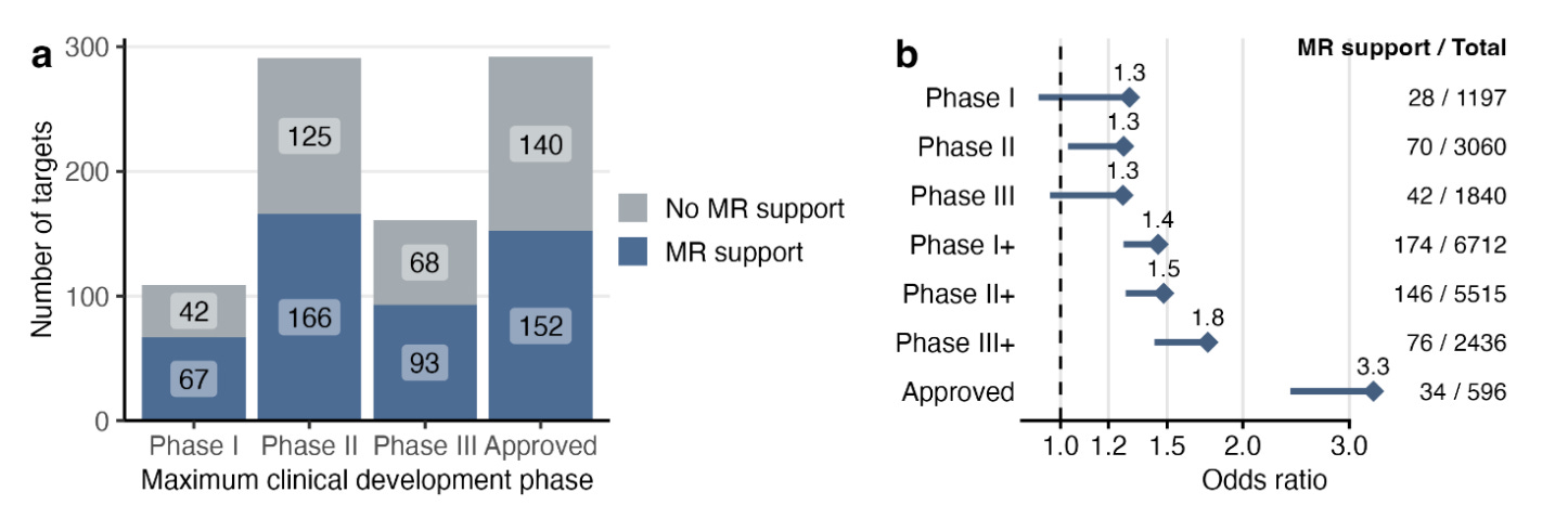 The protein-coding gene-disease pairs with evidence of association in at least one cell type were enriched as drug target-indication pairs across phases of clinical development.