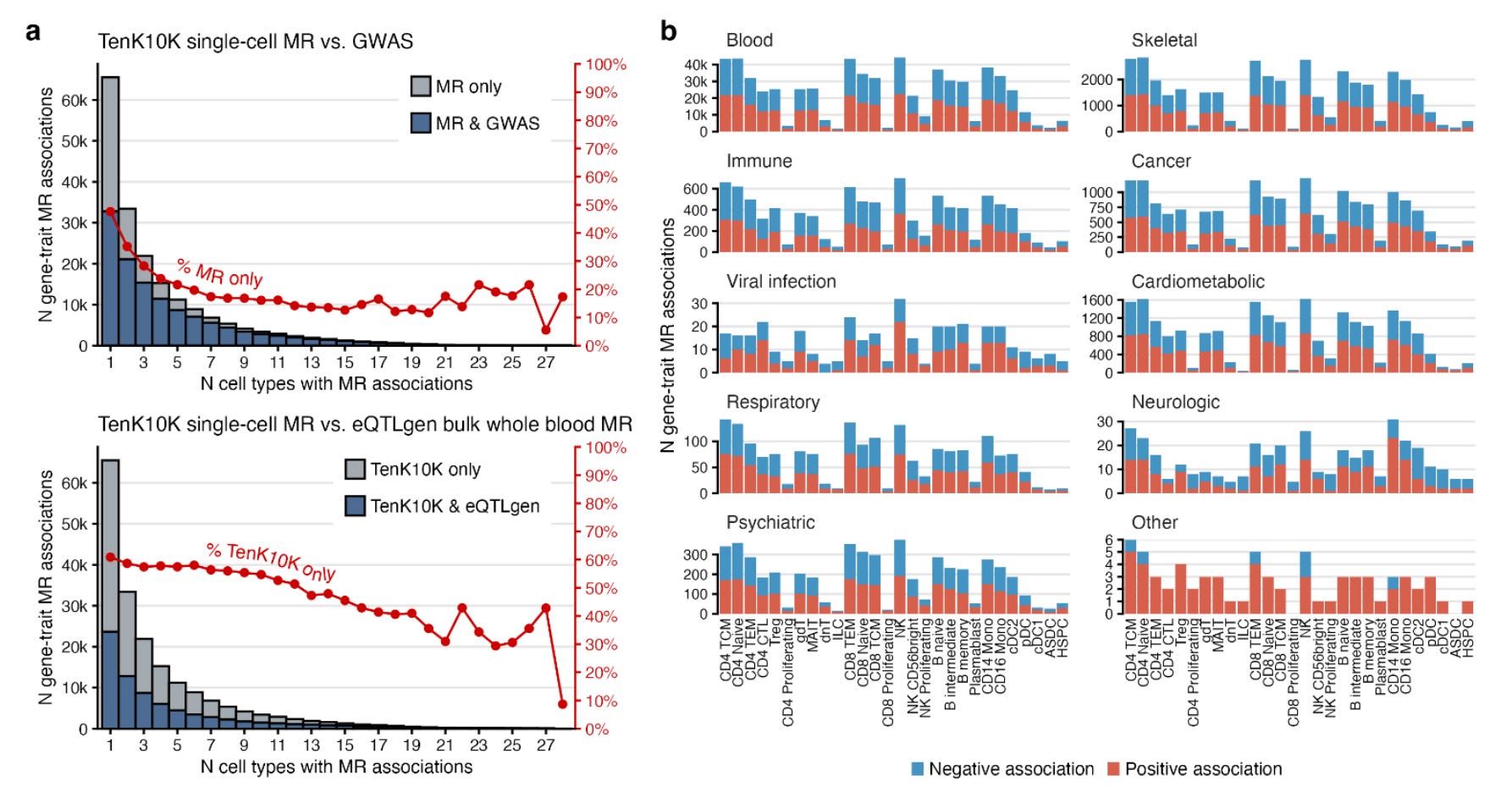 They found a total of 58,058 associations between genetically proxied cell-specific gene expression of 8,672 genes with 53 diseases and 681,480 associations for 16,085 genes with 31 biomarkers. These associations spanned all 28 tested immune cells.